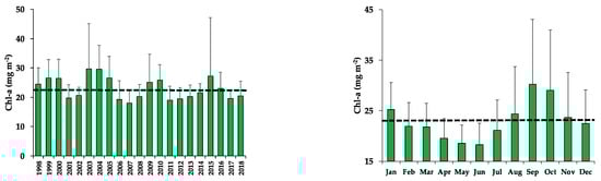 Interannual (left) and annual (seasonal) (right) variation in the water-column integrated chlorophyll-a concentration (Chl-a) in Lake Alchichica. (The dashed lines indicate the average Chl-a value from 1998 to 2018).