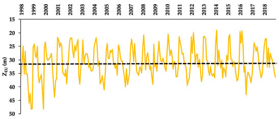 Temporal dynamics of the euphotic zone (ZEU) in Lake Alchichica. (The black dashed line indicates the average ZEU value from 1998 to 2018).