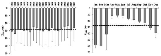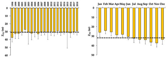 Interannual (left) and annual (seasonal) (right) variation (average ± s.d.) in the euphotic zone (ZEU) in Lake Alchichica. (The dashed lines indicate the average ZEU value from 1998 to 2018).