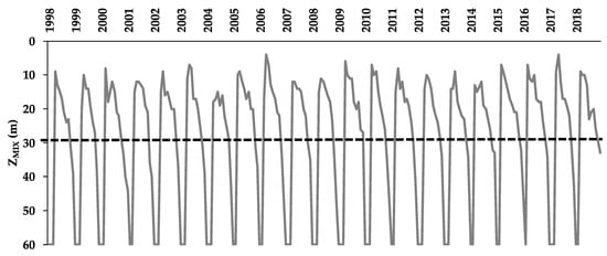 Temporal dynamics of the mixed layer (ZMIX) in Lake Alchichica. (The black dashed line indicates the average ZMIX value from 1998 to 2018).