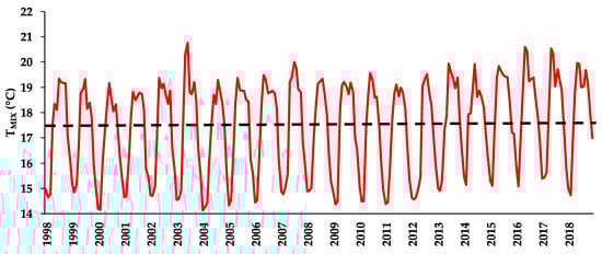 The mixed layer temperature (TMIX) displayed interannual variability in Lake Alchichica from 1998 to 2018 (Figure 8). A recurrent annual pattern evidences the cold/dry and the warm/rainy seasons associated with the tropical climate. The TMIX annual average was 17.4 ± 1.8 °C within a range of 16.9 ± 1.7 °C and 18.2 ± 1.8 °C. There was an increasing linear trend in the TMIX from 1998 to 2018.