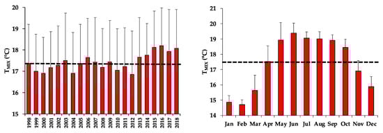 Interannual (left) and annual (seasonal) (right) variation in the temperature (average ± s.d.) in the mixed layer (TMIX) in Lake Alchichica. (The dashed lines indicate the average TMIX value from 1998 to 2018).