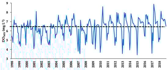 Temporal dynamics of the dissolved oxygen concentration in the mixed layer (DOMIX) in Lake Alchichica. (The black dashed line indicates the average DOMIX value from 1998 to 2018).