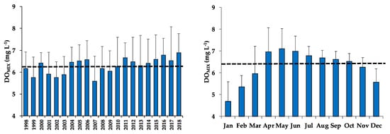 Interannual (left) and annual (seasonal) (right) variation in the dissolved oxygen concentration (average ± s.d.) in the mixed layer (DOMIX) in Lake Alchichica. (The dashed lines indicate the average DOMIX value from 1998 to 2018).
