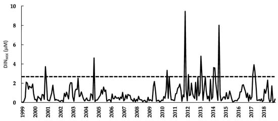 The DINMIX fluctuated interannually (Figure 13). For 45% of the period, the DINMIX was above the annual average, while 55% was below the annual average. The DINMIX displayed a regular dynamic with two periods (Figure 13). The first was when DIN was lower (below the annual average) at the onset and along most of the stratification (April, June to October, and December). The second one corresponded primarily to the mixing season (January to March), May, and November, when DIN was higher (above the annual average).