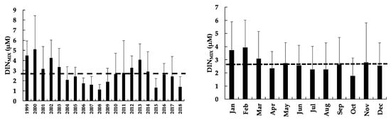 Interannual (left) and annual (seasonal) (right) variation in the dissolved inorganic nitrogen concentration (average ± s.d.) in the mixed layer (DINMIX) in Lake Alchichica. (The dashed lines indicate the average DINMIX value from 1998 to 2018).