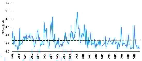 Temporal dynamics of the soluble reactive phosphorous concentration in the mixed layer (SRPMIX) in Lake Alchichica. (The black dashed line indicates the average SRPMIX value from 1998 to 2018).