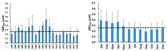 Interannual (left) and annual (seasonal) (right) variation in the soluble reactive phosphorous concentration (average ± s.d.) in the mixed layer (SRPMIX) in Lake Alchichica. (The dashed lines indicate the average SRPMIX value from 1998 to 2018).