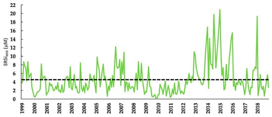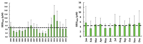 The SRSiMIX fluctuated extensively interannually (Figure 17). For 30% of the period, the SRSiMIX was above the annual average, and for 70% was below the annual average. The SRSiMIX displayed irregular dynamic alternating values below and above the annual average (Figure 17). One-third of the year, SRSiMIX was below the annual average (February, May–June, and September). For the rest of the year (January, March–April, July–August, and October–December), the SRSiMIX was above the annual average.