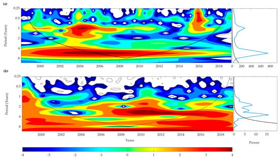 The continuous Morlet wavelet transform was used to normalize monthly time series data and obtain the wavelet power spectrum of the time series. The wavelet power spectrum identifies the periods that are the most important sources of variability across time. In addition, it is possible to obtain a global wavelet spectrum, which is similar to Fourier spectra, that identifies the variance associated with each period for a given time series []. Due to the nature of the data, the original time series is not equally spaced and was made regular using spline interpolation. All the analyses for spline interpolations and wavelet transforms were performed using Matlab.