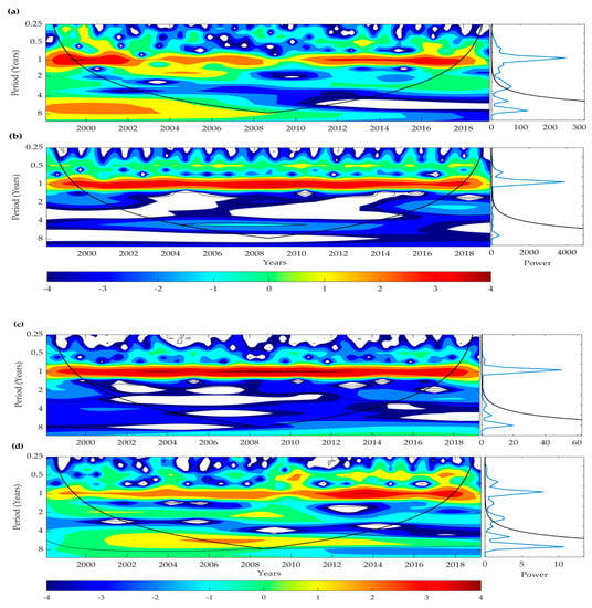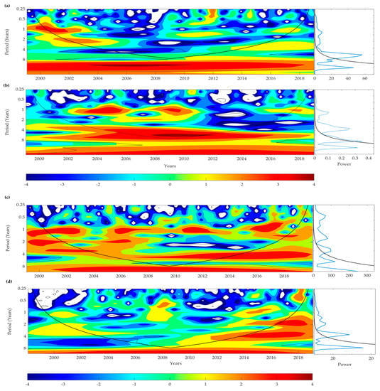 However, the former 2-year periodicity showed shifts between 2002 and 2004 and between 2012 and 2015, whereas the latter’s (~4–5 years) period remained stable for the duration of the time series. This shift in periodicity coincides with the shifts in periodicity displayed by the Chl-a wavelet spectrum (Figure 9).Wavelet analysis of the ZEU, ZMIX, TMIX, and DOMIX showed stable 1-year periodicities for the whole duration of the time series (Figure 19). This steady behavior means that the system’s complexity has not deteriorated so that the seasonality of this process has not perceptibly changed over time. In addition, a 4-year periodicity was significant for the ZMIX time series.
