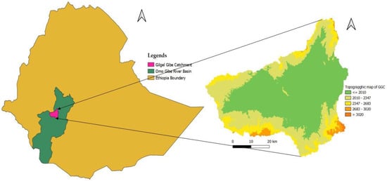 The Gilgel Gibe catchment (GGC) is situated in Eastern Africa in the Omo-Gibe river basin of Southwestern Ethiopia. The watershed geographically (Figure 1) lies between (226126.133, 304388.193) North Latitudes and (811017.916, 883266.897) East Longitudes. Numerous intermittent rivers also characterize the catchment. The primary water source for the rivers is precipitation from the mountainous areas. The weather in Ethiopia is primarily managed through topography and seasonal variations in the Inter-Tropical Convergence Zone []. Ethiopia has a two-season tropical climate. The magnitude of rainfall varies with topography, location, and elevation. The catchment falls within the humid tropical class with a monomodal rainfall distribution. A semi-arid and humid subtropical weather is typically GGC. The cyclic wave of the intertropical convergence area and numerous panoramas mainly affect the climate conditions in Ethiopia. The GGC has an average annual rainfall and air temperature of 1405.8 mm and 18.5 °C, respectively. There is a dry winter weather season between October and April and a wet season (the summer season) between May and September. The geography of the catchment is typically rugged topography with varied mountains, hills, and plains, with upper plateaus divided by deep V-shaped valleys into the flanks and flat river terraces around the main river.