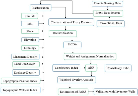 Geospatial techniques, a synergistic effect of RS, GIS, and AHP, were employed to combine ten significant proxy data sets which affect groundwater potential and recharge rates. The proxy information was produced from satellite images using a digital image-processing algorithm. The generated proxy layers were prepared with a GIS environment to reclassify and adjust for further interpretation and spatial manipulation. Finally, a set of weights for their features were decided based on personal judgment and experts’ opinion considering their relative significance for aquifer recharging potentiality in the area of interest. The comprehensive workflow approach for this study to delineate the final PARZ is shown in Figure 2.
