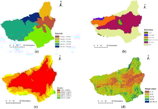 Thematic map of (a) Rainfall, (b) Soil, (c) Elevation, (d) Slope.