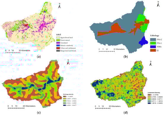 Thematic map of (a) LULC, (b) Lithology, (c) Drainage density, (d) Lineament density.