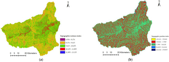 Thematic map of (a) Topographic position index, (b) Topographic wetness index.