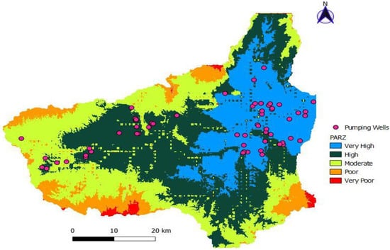 The probability of aquifer recharge zone defined by geospatial techniques is usually validated by matching existing inventory data []. The validity of the potential aquifer recharge map was performed by overlaying the point data of inventory wells with the generated PARZ map. In addition, the result has been validated using the available inventory data or pumping wells information in the catchment (Figure 6). The validation points of the PARZ indicated that most of the production wells are located in very high (57%), high (32), and moderate (12%) delineated recharge zones with a productivity rate range of 0.35—21.6 L/s. This supports an agreement between the groundwater inventory data and PARZ defined using geospatial techniques. Based on the distribution of wells and the corresponding yield values, the developed PARZ map was complimented as a proxy for the aquifer productivity of existing pumping wells. Depending on their productivity, most African aquifers [,] are classified as very high (>20), high (5–20), moderate (2–5), low-moderate (0.5–2), low (0.1–0.5), very low (<0.1) in liters/second. However, from total inventory wells in the Gilgel Gibe catchment, according to the aquifer productivity classification of most African aquifers [,], there exists very high (25%), high (22%), moderate (28%), and low (25%) production wells. Therefore, the developed aquifer recharge map and the production wells are mismatched at some locations. This study verifies that the applicability of proxy data sources to delineate is trustworthy in groundwater development and management. This confirms that the significance of the weighted influencing parameter threshold values through GIS-based overlay analysis as credible support for delineating potential recharge zones is valuable for stakeholders to augment groundwater management and reduce the uncertainty of the decision-making process and resources allocation.