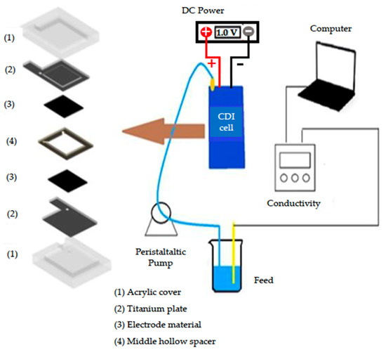 Capacitive deionization (CDI) is an emerging technology for deionization from salt-containing water. CDI has many advantages, such as low energy demand, no secondary pollution, and easy operation and maintenance, and has been applied to desalination of brackish water [9,10], water softening [11], and wastewater treatment [12]. The principle of CDI is to apply an external electric field to the electrodes, and cations in the water are attracted by the negative electrode, while the anions are electrosorbed onto the opposite positive electrode. The core of the CDI system is the electrode material. Carbon-based materials, such as activated carbons [13,14], carbon aerogels [15], carbon nanotubes [16,17], and graphene [18], have been widely employed as electrode materials in CDI systems.