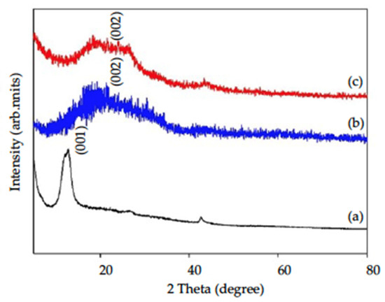 XRD patterns of GO, rGO with/without acid modification are shown in Figure 2. Graphene oxide (GO) had a sharp peak between 2θ = 10–12° ((a) in Figure 2), which is the characteristic peak of GO indicating (001) crystalline structure [23]. After reduction with HMTA, the characteristic peak of GO disappeared, followed by a half-rounded convex peak appearing at 2θ = 20–25°, which indicated that an amorphous (002) structure of graphene (rGO) had formed ((b) in Figure 2) [29]. With chemical modification (HNO3:H2SO4 = 2:1), GO became porous graphene oxide firstly and then reduced to rGO with HMTA. XRD patterns of am-rGO ((c) in Figure 2) had similar patterns as those of rGO without acid modification, which indicated the crystalline structure did not change due to acid modification.