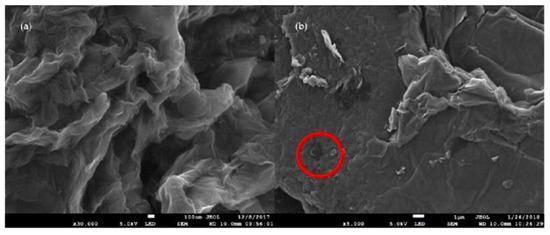 The surface morphology of graphene (rGO) with/without acid modification is demonstrated in Figure 3. Graphene without chemical modification (Figure 3a) had a lamellar, wrinkled layered structure, which is consistent with structures reported by other studies [23,30]. The smooth and flower-like topography can be found in rGO without acid modification. After acid treatment and then being reduced to rGO, the surface of rGO was damaged due to the strong acid treatment (Figure 3b). The corrosive strong acids etched the GO surface (as shown in red circle), and made it become a crushed and more porous structure. The uneven surface morphology and etched holes with diameters of 500–800 nm were found on the am-rGO. The unsmooth surface and more porous structure of the acid-modified rGO can provide more ion accessibility, which indicates improving the sorption of ions.