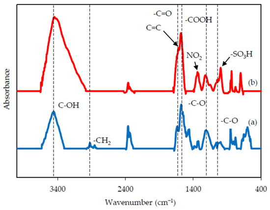 FTIR spectroscopy was further explored to reveal differences in functional groups between rGO with/without chemical modification (Figure 4). The strong peak at 3443 cm−1 represents the hydroxyl groups (C-OH). The -CH2 absorption bands centered at 2921 cm−1 (asymmetric) and 2852 cm−1 (symmetric) assigned to alkyl moieties were only observed in rGO without acid modification. The -C=O stretching vibration of carbonyl groups and -COOH carboxyl group were located at 1632 and 1584 cm−1, respectively [31]. The absorption bands of -C-O (expoxy) and -C-O (alkoxy) at 1220 and 1060 cm−1, respectively, were also identified [18]. The differences in functional groups of acid-modified rGO can be found at 1619, 1339, and 1040 cm−1, which were attributed to aromatic bonds (C=C), NO2 stretching, and sulfonic acid (-SO3H) groups [32], respectively, due to the strong reactions of strong acids (HNO3:H2SO4 = 2:1) on rGO [25].