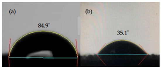 Contact angle images of (a) rGO and (b) am-rGO.