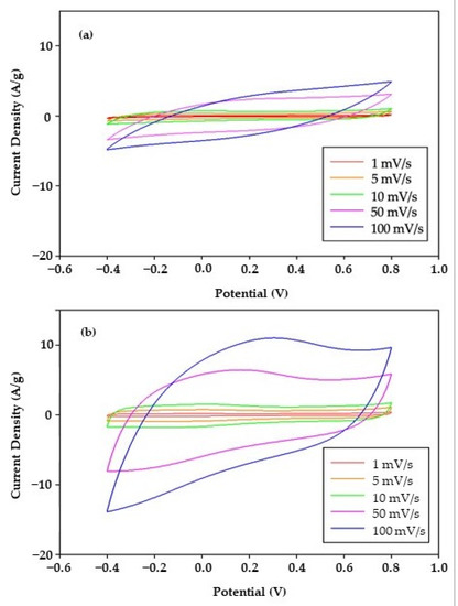 Cyclic voltammograms (CV) of (a) rGO and (b) am-rGO at various scan rates.