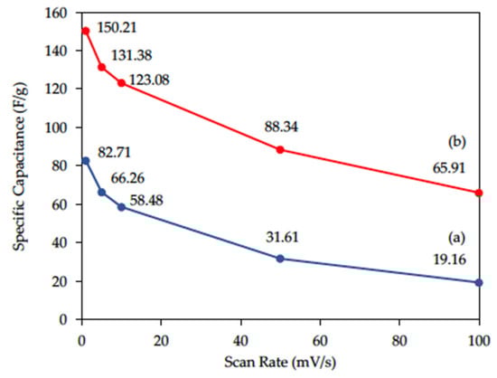 Mass normalized specific capacitance of (a) rGO and (b) am-rGO with respect to the scan rates.