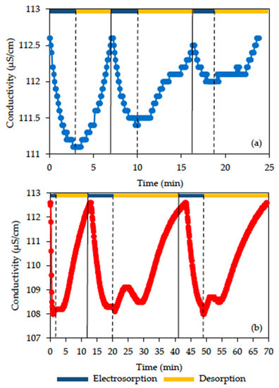 Co: initial conductivity of NaCl solution for each electrosorption cycle (μS/cm), Ct: final conductivity of NaCl solution for each electrosorption cycle (μS/cm).