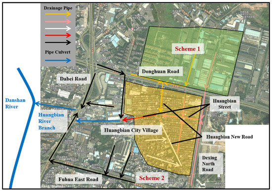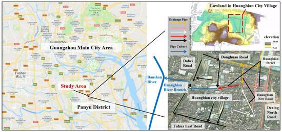 Huangbian Village, located in the midsouth of Guangzhou, belongs to the Shiqiao neighborhood of Panyu District, covering an area of 0.4 km2 and accommodating a population of 9630. Surrounded by Donghuan Road, Dexing North Road, Fuhuang East Road, and Dabei Road, the village is encircled by built-up regions and accounts for a typical “urban village” in Guangzhou (Figure 1). With four sides higher than the middle part, the village has a saucer-shaped terrain, with a sea-level elevation of merely 4.7–9.0 m, in contrast to an elevation of 8.1–20.0 m of the surrounding roads. The drainage pipe networks of the village and surrounding areas form a combined drainage system. The drainage system in upstream consists of three sub-regions: the north region, east region, and south region, which have a water catchment area of 13.48 hm2, 11.56 hm2, and 29.31 hm2, respectively. In the northern sub-region, the pipe network is allocated along the northern part of Donghuan Road and Huanbian New Road, and the water flows southwards from the north; in the eastern sub-region, the water flows westwards from the east along Dexing North Road and Huangbian Street; in the southern sub-region, the water flows northwards from the south along Huangbian New Road. Water in these three sub-regions converges at the intersection between Huangbian Street and Huangbian New Road, which then flows westwards to Huangbianchong along Huangbian Street before entering the Danshan River. The water level of the Danshan River is subject to the influence of downstream sluices and tides, which has significant jacking effects on the pipe network of Huangbian Village and the surrounding areas. With a disc-shaped landform, the village sees a severe inflow of rainwater from adjacent regions during rainfalls, which, combined with the jacking effect of the Danshan River, results in severe waterlogging disasters in the village. The frequent outbursts of waterlogging disasters have posed a serious threat to local social and economic development.