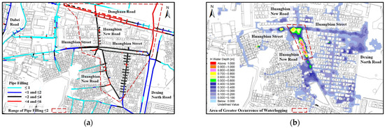 Figure 3 shows simulated results of the degree of fullness of the pipe network and waterlogging situations in the study area. As Figure 3a shows, pipes of Huangbian New Road, Huangbian Street, and Donghuan Road have a high degree of fullness and a poor discharging capacity and hence are susceptible to waterlogging disasters. The simulation indicates that the major waterlogged sites include the intersection between Huangbian New Road and Huangbian Street, as well as the low-lying area that is 70 m south of Huangbian New Road: the area of waterlogged regions with a depth of water of 0.15 reaches 2.06 hm2, and the maximum inundation depth is 0.95 m.