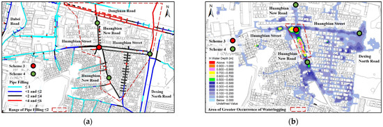 In Scheme 1, the waterlogged area with an inundation depth larger than 0.15 m was reduced to 1.98 hm2 (a drop of 4%), and the maximum inundation depth was reduced by 2% to 0.93 m. Scheme 2 reduced the waterlogged area by 16% to 1.69 hm2 and cut the maximum inundation depth by 13% to 0.93 m. To sum up, Scheme 2, which reduces the permeability of regions of drainage bottleneck of the pipe network near the waterlogged site, achieves a better effect than Scheme 1. Figure 6a,b and Table 2 show the simulation results of Schemes 1 and 2 under designed rainfall conditions.