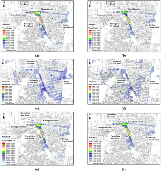 Schematics of different schemes against waterlogging under designed rainfall conditions. (a) Scheme 1; (b) Scheme 2; (c) Scheme 3; (d) Scheme 4; (e) Scheme 5; (f) Scheme 6.