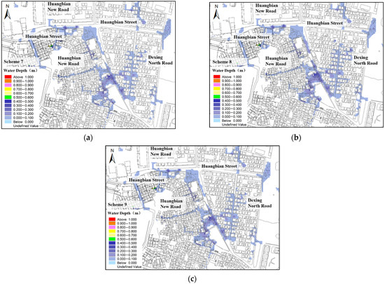 Simulation results of comprehensive schemes under designed rainfall conditions. (a) Scheme 7; (b) Scheme 8; (c) Scheme 9.