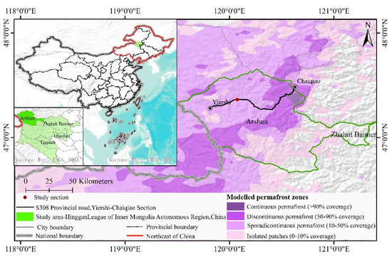 In this paper, the study area is located in the northwestern part of the Da Xinganling Mountains. The road area of the construction project from Yiershi to Chaiqiao on Provincial Road 308 in the Inner Mongolia Autonomous Region, China, with a geographical location of 47°15′59″ N, 119°48′46″ E to 47°28′22″ N, 120°36′59″ E, as shown in Figure 1. The climate of the study area is influenced by a combination of warm and humid marine airflow from the southeast and dry and cold airflow from the northwest, resulting in an alpine climate with a mean annual air temperature of approximately −3.1 °C [37,38]. The mean annual rainfall is 410–470 mm, mostly concentrated from June to August. The snowfall in winter is 36.8 mm, accounting for 6.7% of the annual precipitation. The frost-free period is 70–120 days, and the annual average maximum freezing depth is 3.1 m. As this area is located at the southern edge of the Eurasian permafrost regions, the permafrost layer here varies in thickness from a few meters to tens of meters and is mainly developed in low-lying swampy wetlands and at the foot of mountain slopes [39].