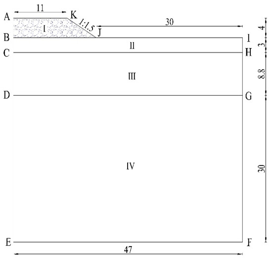 We determine the size and calculation unit of the geometric model according to the following points: first, according to the subgrade cross-section construction drawing to determine the width of the top of the embankment, embankment height, slope rate, and other parameters; Second, we drilled five boreholes with a depth of 24 m at the foot of the slope, the shoulder, and the centerline of the road. Based on the borehole data, the parameters of the soil layers are determined. Zone I is a filled block-stone layer above the natural ground surface, with a height of 4.0 m. The width of the top of the embankment is 11 m, and the slope ratio is 1:1.5. Zone II is a clay layer below the natural ground surface, with a thickness of 3.0 m. Zone III is a strongly weathered basalt layer, with a thickness of 8.8 m. Zone IV is a moderately weathered basalt layer. To reduce the influence of the boundary effect, the model is extended horizontally 30 m from the foot of the embankment slope to the right direction and vertically 30 m from the bottom of zone III vertically downward.