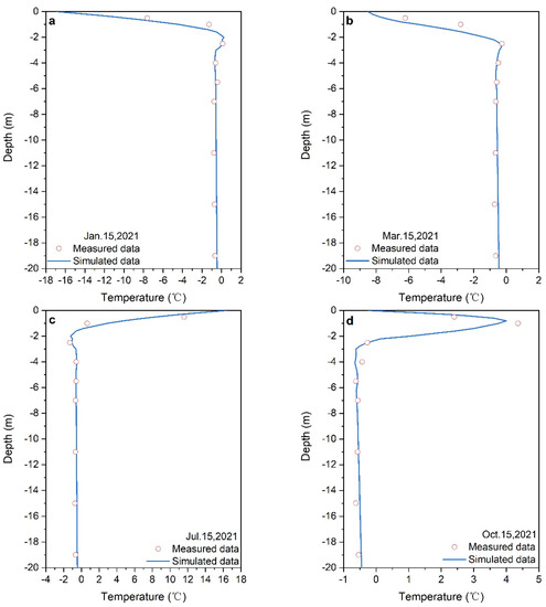 Assuming that the hydrologic and thermal conditions of the foundation before embankment construction are stable, the hydrologic and thermal fields of the foundation soils are calculated without considering climate warming. When the ground temperature below the depth of the annual change tends to be stable, the hydrologic and thermal conditions of the foundation can be used as the initial conditions for the numerical simulation. The calculation results in Figure 3 show that the measured and calculated values of the borehole ground temperature match well. It should be noted that the S308 road has not yet been completed (until April 2022), but the subgrade project of the K32 + 900 section studied in this paper was completed on 15 October 2021. Since the thermal disturbance generated by subgrade engineering changes the hydrologic and thermal states of the original foundation, the hydrologic and thermal conditions of the foundation on 15 October 2021 are used as the initial conditions for the numerical calculation, and the water content, temperature, and deformation will be calculated for 20 years after the embankment is completed in a warming climate.
