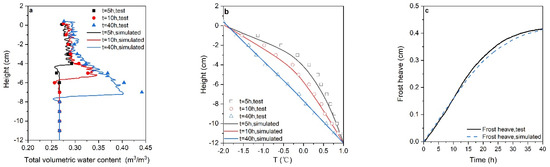 It should be noted that the test temperature is slightly higher than the simulation temperature for t = 5 h (Figure 4b). This is because when the cold bath temperature is adjusted from 1 to −2 °C, the temperature at the top of the soil sample cannot reach −2 °C instantly, resulting in the cooling rate of the soil being slightly lower than the theoretical value at the beginning of the experiment. With the increase in freezing time and freezing depth, the migration rate of the freezing front gradually decreases, resulting in the decrease in this deviation. Therefore, the simulated and measured temperatures match well for t = 10 h and 40 h. In Figure 4a, when the measured volumetric water content is high (>0.4), there is a deviation between the measured values and the simulated values. This is because there is an ice lens at this height, which makes it difficult to slice the soil samples. Therefore, there may be a deviation in the measured values.