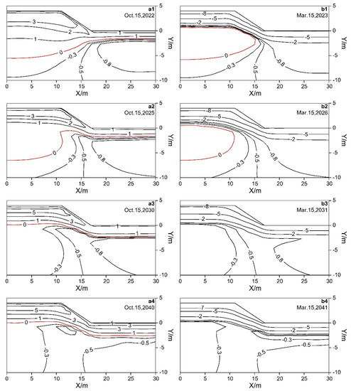 The maximum seasonal thawing depth in the study area is reached in October each year when the permafrost table under the subgrade is the deepest. Figure 5(a1–a4) show the temperature distributions on 15 October of different years after the completion of the subgrade. Due to the influence of climate warming and engineering thermal disturbance, the permafrost tables decrease from −2.175 to −6.302 m from 15 October 2021 to 15 October 2025, and the average permafrost degradation rate is 1.032 m/a. From 15 October 2025 to 15 October 2041, the permafrost tables will rise from −6.302 to 0.109 m, and the permafrost that had previously thawed refreezes again. This phenomenon is related to the water migration process in different seasons and the heat transfer mechanism of the block-stone layer.