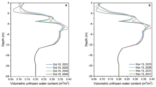 From 15 October 2021 to 15 October 2025, the permafrost table continues to fall, increasing unfrozen water content near the freeze–thaw interface (at a depth of −6.302 m). This is because the temperature gradient and matrix potential gradient gradually decrease with increasing depth, which makes it difficult for most of the unfrozen water in the deep foundation to migrate to the ground surface. From 15 October 2025 to 15 October 2041, the rise in the permafrost table results in a decrease in the unfrozen water content near the freeze–thaw interface. Notably, at a depth of −3 m, the water continues to migrate to the active layer and discharges out of the subgrade, resulting in the unfrozen water content decreasing over time.