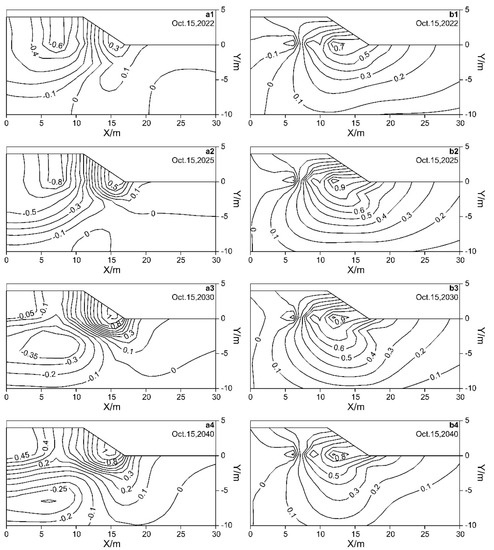 The permafrost table in the study area is the lowest in October every year when the subgrade settlement is the largest. Figure 7(a1–a4) show the vertical deformation distributions of the subgrade on 15 October in different years. From 15 October 2021 to 15 October 2025, the continuous decrease in the permafrost table leads to increasing settlement. The maximum settlement reaches −0.835 cm (the positive and negative signs in this paper only represent the deformation direction), which is located at 7.156 m on the right side of the road centerline. From 15 October 2025 to 15 October 2040, the freezing of unfrozen water within the thawing interlayer reduces the subgrade settlement. By 15 October 2040, the vertical deformation of the top surface of the subgrade is positive, and the maximum vertical deformation is +0.951 cm, which is located at the road centerline. In this process, frost heave is greater than settlement. There are two reasons for this phenomenon: first, the thawing settlement lags behind permafrost thawing [4], and the short thawing time of the permafrost causes most of the meltwater under the embankment to drain too late. This results in less settlement from 15 October 2021 to 15 October 2025. Second, during the meltwater refreeze process, a large amount of water migrates toward the freezing front and forms an ice lens [4,27], resulting in a larger frozen heave.