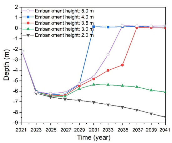 From 2021 to 2025, the permafrost tables under the road centerlines of the five structures fall rapidly (Figure 8), but the change rates do not differ significantly. From 2025 to 2041, the permafrost tables under the road centerlines of the three structures with block-stone layer thicknesses of 5 m, 4 m, and 3.5 m are raised to 0.226 m, 0.109 m, and 0.106 m, respectively. At this time, the active layer is located within the block-stone layer, and there is no thawing interlayer in the foundation. The thermal stability of these three structures is good because the deformation of the block-stone layer is minimally affected by seasonal freezing and thawing. However, the permafrost tables under the road centerlines of the two structures with block-stone layer thicknesses of 3 m and 2 m drop to −6.064 m and −8.461 m, respectively. Permafrost degradation increases the settlement and, thus, destabilizes the subgrade. Therefore, the thickness of the block-stone layer should not be less than 3.5 m from the perspective of thermal stability.