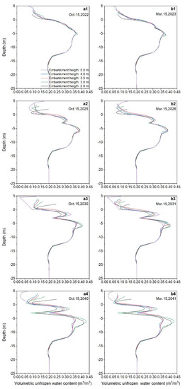 Vertical distributions of volumetric unfrozen water content under the road centerlines of different structures: (a1–a4) vertical distributions of volumetric unfrozen water content in warm seasons and (b1–b4) vertical distributions of volumetric unfrozen water content in cold seasons.