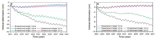 Under the gravity of the embankment filling layer, uplift deformation will occur at the slope toe. The increase in foundation settlement will also squeeze the soil near the slope toe, resulting in a further increase in uplift deformation. Figure 7(a1–a4) show that the maximum uplift deformation is +1.029 cm from 15 October 2021 to 15 October 2031, with an average rate of increase of 0.103 cm/a. The maximum uplift deformation is +1.038 cm from 15 October 2031 to 15 October 2040, with an average rate of increase of 0.001 cm/a. The location of the larger uplift deformation is mainly located near the slope toe, and this local deformation has less influence on the subgrade stability. Therefore, this paper does not conduct an in-depth analysis.