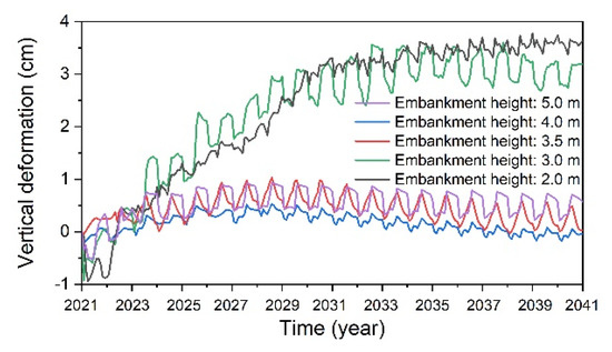 Comparing the vertical distributions of volumetric unfrozen water content under the road centerlines of the five structures (Figure 9), it can be seen that the smaller the embankment height is, the greater the unfrozen water content in the block-stone layer. This is because the increase in embankment height increases the water convection flux of the slope, thus reducing the unfrozen water content in the block-stone layer. The change in unfrozen water content in the block-stone layer has less effect on embankment deformation because it can resist the uneven deformation caused by the water phase change.