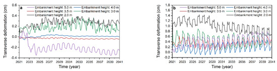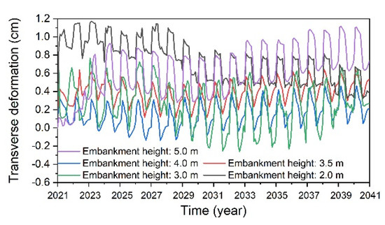 Comparing the transverse deformations at the road centerlines and the shoulders of the five structures with block-stone layer thicknesses of 5 m, 4 m, 3.5 m, 3 m, and 2 m from 2021 to 2041 (Figure 12), it can be seen that the maximum transverse deformations at the road centerlines are −0.352 cm, −0.056 cm, −0.046 cm, +0.374 cm, and +0.376 cm and that the deformations at the shoulders are +0.767 cm, +0.465 cm, +0.621 cm, +0.893 cm, and +1.435 cm, respectively. Among them, the maximum transverse deformations at the road centerlines and the shoulders of the two structures with block-stone layer thicknesses of 3.5 m and 4 m are smaller, and their stability is better. The other structures undergo large deformations, resulting in poor stability. Notably, the increase in the self-weight load of the embankment increases the subgrade settlement when the thickness of the block-stone layer reaches 5 m. The increased settlement produces greater tensile stress, which leads to a larger transverse deformation.