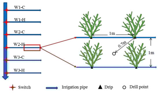 We selected six rows of H and C in the current study in 2016. All plants were the same age (8 years old) and were planted in the same field. Each row had one type of plant and the interval between adjacent rows was greater than 5 m to avoid water exchange between the different rows. Twenty trees were planted in each row and the distance between each tree was 1 m. Drip irrigation pipes were laid close to the trunk, the water outlet holes were spaced with 1 m, and the drip flow rate was 1.5 L/h. The specific field configuration is shown in Figure 2. All H and C trees were irrigated with saline groundwater with a 10-day time interval through a drip irrigation system with three irrigation levels of 17.5 mm (W1), 25 mm (W2) and 35 mm (W3), and all other basic agronomical practices were the same. In September and October, the time interval of irrigation increased so that plants were irrigated with groundwater every 15 days. Plants were not irrigated from November to February. The salt concentration of the groundwater was 4.02 g L−1.