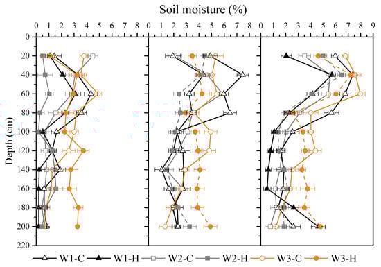 In July, August and September, the soil water content of 0–100 cm layer under W2 treatment was less than W3 and W1 for C, and the content under W3 was the largest for H. The soil water content under W2 treatment was the lowest in July and August, and the soil water content under W1 treatment was the lowest in September for H and C (Figure 3).