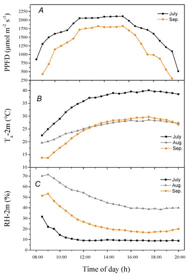 Diurnal changes in the photon flux density (PPFD) (A), air temperature (Ta) (B) and air relative humidity (RH) (C) for July, August and September in 2016.