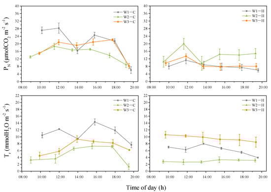 The diurnal differences in the net photosynthetic rates (PN) of C and H under different irrigation levels are shown in Figure 5. The daily variations of PN for C in the W1 treatment showed a bimodal curve and displayed an obvious “midday depression” phenomenon. However, only a slight “midday depression” phenomenon was observed in the W2 and W3 treatments. The depression of PN for C in the W1, W2 and W3 treatments appeared around 14:00. For the daily mean PN (from 9:00–19:00), the highest value was recorded in W1 (21.27 μmol (CO2) m−2 s−1), followed by the W3 (14.86 μmol (CO2) m−2 s−1) and W2 (13.80 μmol (CO2) m−2 s−1) treatments.